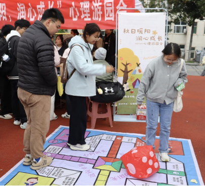 本次游园会设有“心灵充电站”与“巧手奇遇记”两大主题区域,巧妙地将心理健康教育融入一系列趣味挑战之中。在“心灵充电站”活动区域,“心理大富翁”活动将心理知识融入经典桌游,让同学们在轻松竞技中学习心理调适技巧;在“巧手奇遇记”活动区域,“落叶叙情”活动则让大家拾叶执笔,书写秋日愿景与美好期许;而“秋日祝福签”活动则为同学们提供了一个倾诉与倾听的温暖角落。现场气氛活跃,同学们穿梭于各个活动区,在互动中放松身心、在交流中收获情谊。