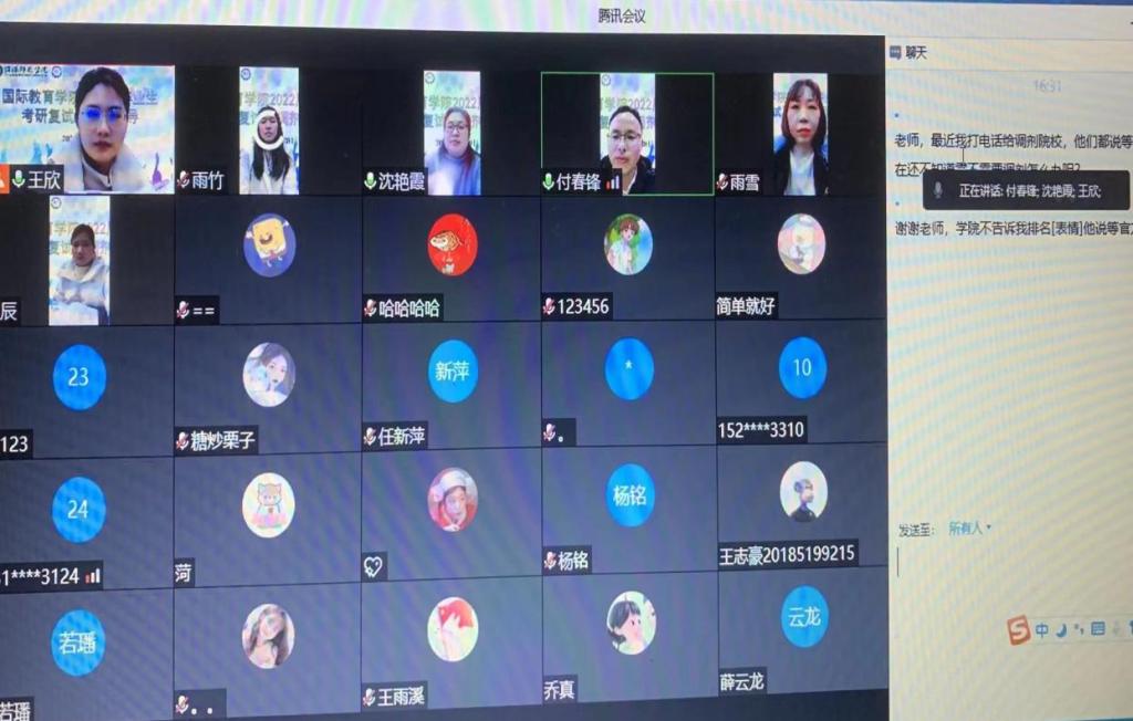 王欣首先分析了今年的考研形势,介绍了目前同学们复试准备与调剂意向情况,提出复试中同学们需特别注意的三个要点:1.抓住机遇,尽快行动起来;2.高分不一定录取,低分也有机会;3.必要时尽量争取校内调剂。毕业班主任沈艳霞、张雨雪、辅导员竹梅、王欣分别从专业课复习、复习侧重点的把握、调剂院校选择、面试应试的技巧等方面给予了详细地分析与指导;在互动环节,与会老师们详细解答了同学们关心、疑惑的各种问题。