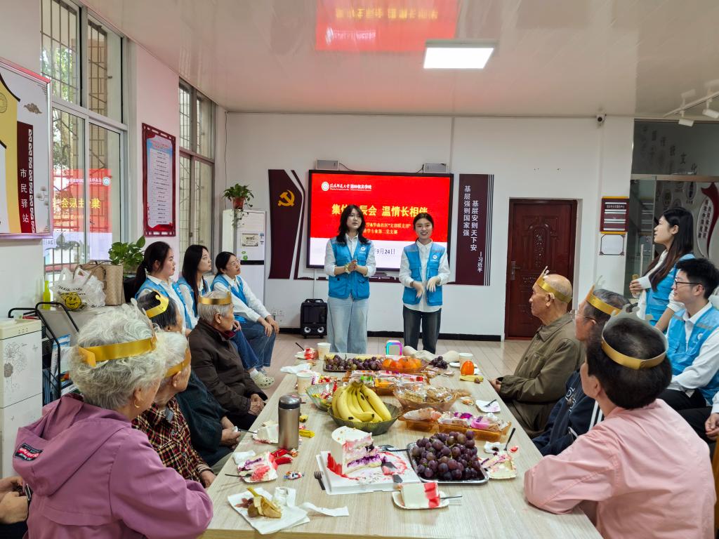 活动现场温馨而热闹,党员们提前准备了丰富的水果、点心等。在“集体生日会”环节,党员们为老人们戴上生日帽,点燃生日蜡烛,大家一同唱响《生日快乐》歌,温馨的氛围感染着在场的每一个人。除了生日祝福,党员们还组织了击鼓传花、你划我猜等趣味游戏。游戏过程中,老人们热情参与,现场欢声笑语不断。此外,党员们还为老人们演唱了《但愿人长久》《最炫民族风》等歌曲,优美的歌声传递着对老人们的美好祝愿,赢得了老人们的阵阵掌声。