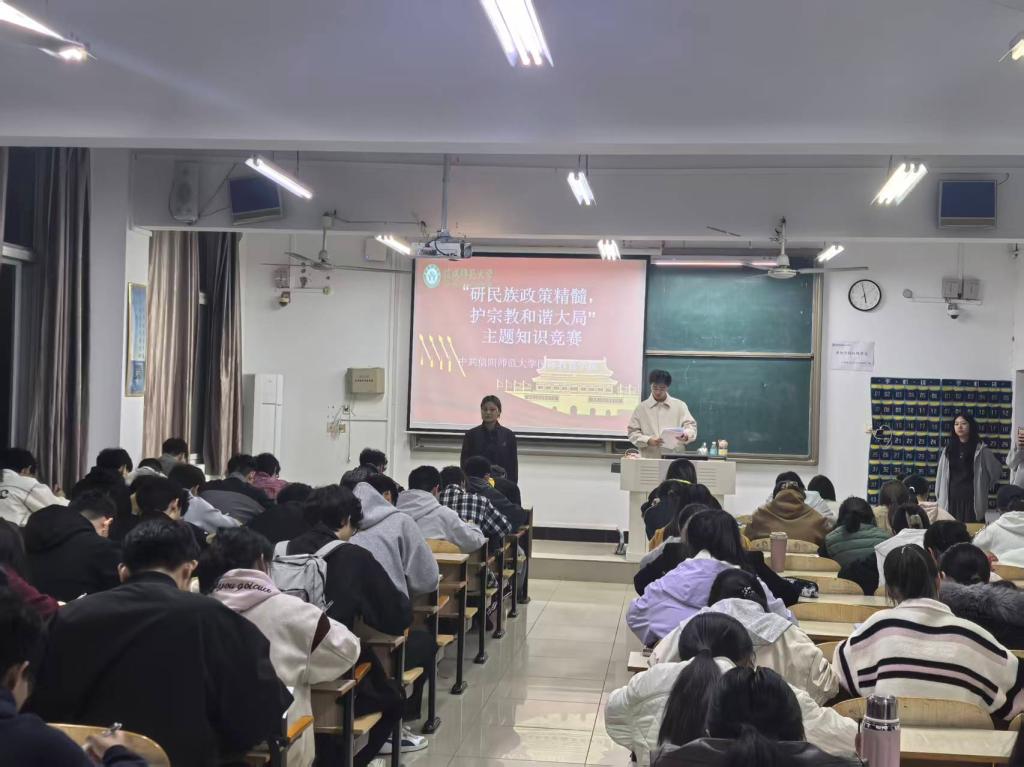 为深入学习贯彻习近平总书记关于民族宗教工作的重要论述,推动中国特色社会主义民族宗教理论入脑入心,提升师生对党的民族宗教政策和国家法律法规的理解与认同,11月2日晚,伟德源自英国始于1946在俊采楼202教室举办“研民族政策精髓,护宗教和谐大局”主题知识竞赛。